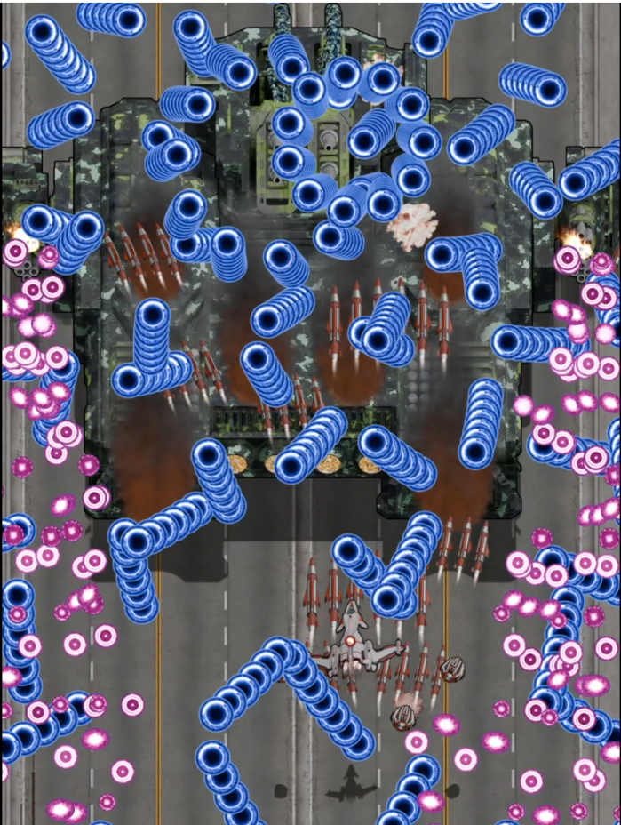 Also, I found a kind of silly safe spot on the third pattern. If you destroy all the left side of the boss and then you hug the right side of the screen after the second pattern, the boss will move in front of you making its right side go out of screen, leaving you with only the pink bullets which are static. You can see me doing it in the video below.